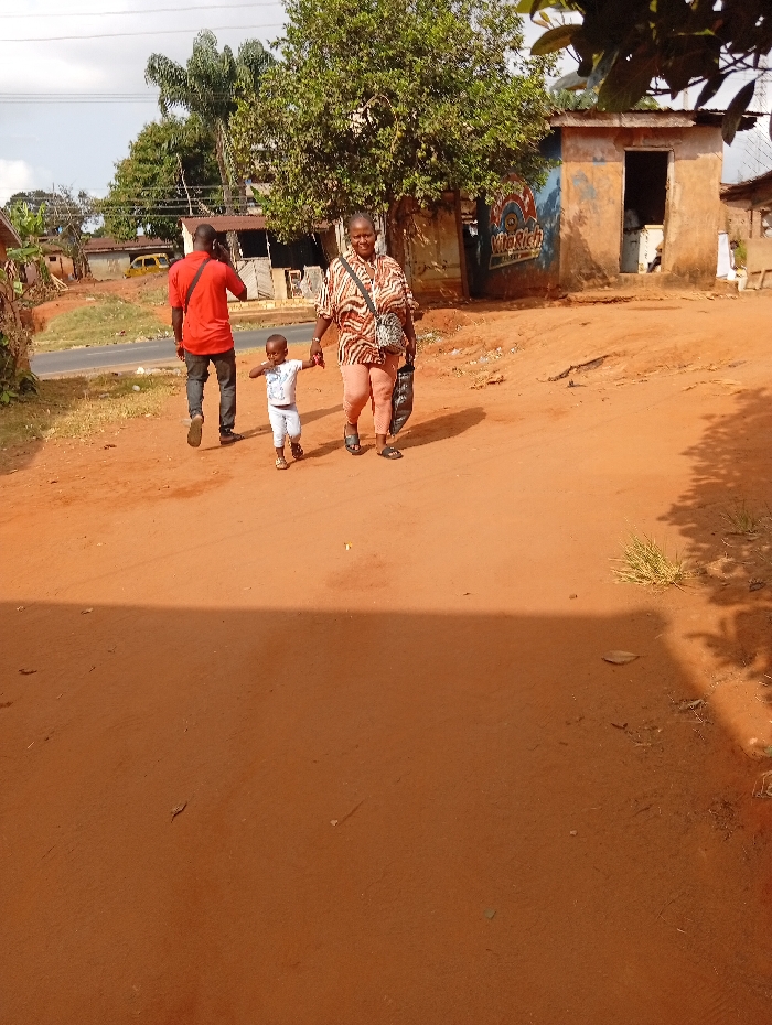 The image depicts an outdoor scene in Nkpor, Nigeria, on an unpaved red-orange dirt road under direct daylight