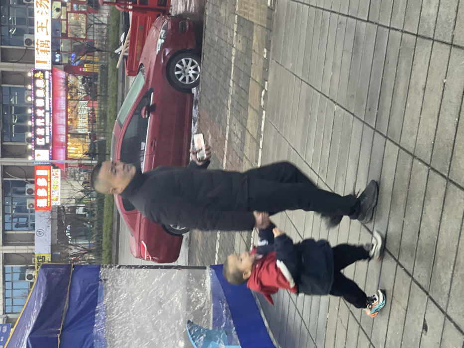 An adult East Asian male and a young East Asian child are walking hand-in-hand on a wet, tiled sidewalk in Shuangfu, China