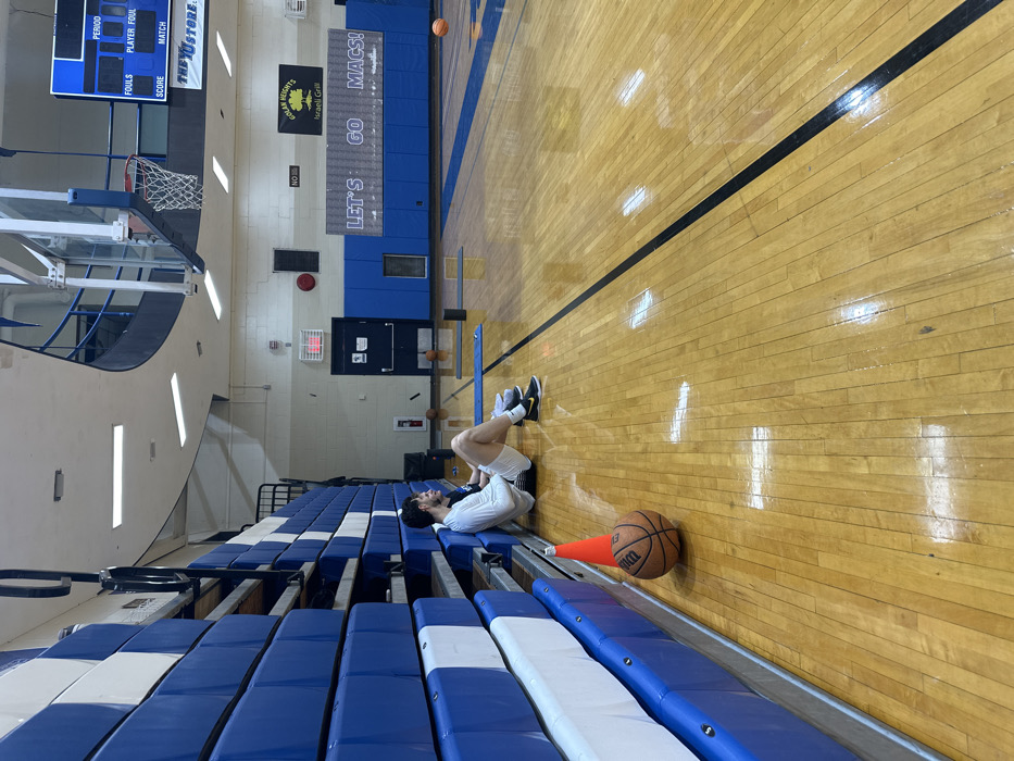 An indoor basketball court is depicted, identified as part of Yeshiva University, located in New York City, United States, indicated by "THE YU STORE" on the scoreboard and "LET'S GO MACS!" on a banner, referring to the university's athletic teams. The court features a polished light-brown hardwood floor with black boundary lines and is illuminated by overhead fluorescent lighting. Blue and white retractable bleachers line the left side of the frame. A male individual is seated on the lowest row of these bleachers, leaning against them. He wears a white long-sleeved shirt, white shorts, and black athletic shoes with white soles and a Nike swoosh. His legs are bent, and he appears to be resting. A second person, partially visible behind him on the bleachers, wears a dark shirt. In the foreground, an orange basketball with "WILSON" visible on its surface rests on the court, leaning against an orange traffic cone. Further onto the court, near the seated man, a blue exercise mat is laid out, with a dark, rectangular object positioned on it. Several additional basketballs are scattered across the court in the background. A basketball hoop with a clear backboard and blue support structure is visible in the upper right quadrant, alongside a digital scoreboard displaying "PERIOD," "FOULS," "PLAYER FOUL," and "SCORE," with "THE YU STORE" beneath it. The back wall features doors, a "NO SMOKING" sign, a banner stating "LET'S GO MACS!", and another sign for "GOLAN HEIGHTS Israeli Grill."