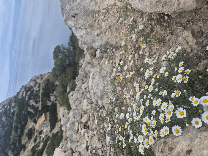 The image captures a rocky coastal landscape within the Municipal Unit of Loutraki - Perachora, Greece, viewed from an elevated position. In the immediate foreground, a dense cluster of white-petaled flowers with yellow centers, resembling daisies, grows amidst light-colored, fragmented rocks and sparse green foliage. The ground exhibits an irregular, unpaved texture composed of soil and varying sizes of stones. The midground features a descending rocky cliff face, sparsely vegetated with green shrubs and small trees. A narrow, winding path or track is visible traversing the upper-left section of this incline. Further down the slope, a light-colored, single-story building with a reddish-brown roof is discernible, integrated into the natural contours of the hillside. The background displays a vast expanse of calm, grayish-blue water, indicative of a sea or gulf, stretching towards a distant, hazy horizon where faint landmasses are visible. The sky above is uniformly overcast, diffusing natural light across the scene. No individuals, animals, or active subjects are present in the depicted environment.