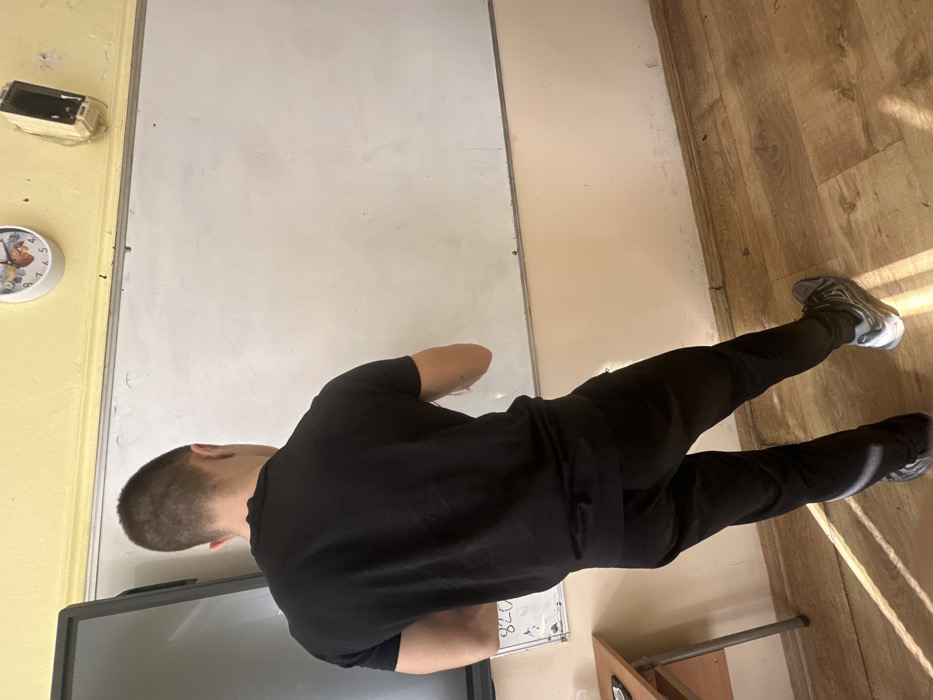 An individual, observed from behind, stands facing a large white dry-erase board in what appears to be a classroom in Cherven Bryag, Bulgaria. The person has short, cropped hair, wears a black short-sleeved t-shirt and black pants, and grey and black athletic shoes. Their right arm is slightly raised, suggesting interaction with the board. To the left of the white board, a dark-framed interactive digital display or television screen is visible. Below the digital display and to the left of the white board, a smaller white board or poster with "820" written on it is mounted. A wooden desk with a metallic frame is partially visible in the lower-left foreground. Above the main white board, the wall is painted light yellow. Mounted on the yellow wall is a round, white clock with a colorful image in its center, indicating approximately 10:25. To the right of the clock, a damaged, off-white, rectangular object, possibly an intercom speaker or a ventilation cover, is attached to the wall. The wall below the main white board is light beige with some staining or discoloration near the baseboard. The floor is made of light brown wood laminate, reflecting diagonal strips of light from an unseen window.