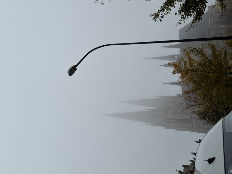 The image captures a foggy urban scene in Strasbourg, France. The central subject is the Temple Neuf, a large stone church with two prominent, tall, Gothic spires and numerous smaller pinnacles, partially obscured by dense grey fog in the mid-background. In the immediate foreground, the upper left portion of a white vehicle, likely a van, is visible, featuring a black antenna on its roof. A dark, curved street light pole with an oval fixture stands vertically in the mid-ground on the right side of the frame. Several trees with autumnal foliage, displaying yellow and orange leaves, are positioned in the mid-ground between the foreground elements and the church. The environment is dominated by thick, uniform grey fog, limiting visibility and creating a diffused light. No individuals, specific actions, or interactions are visible within the frame.