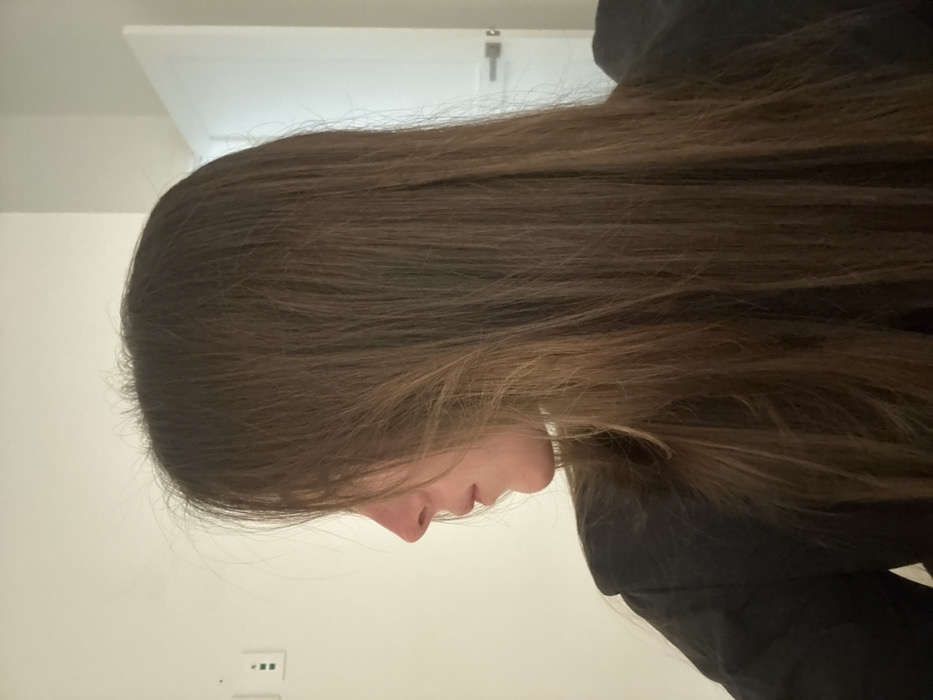 A female individual is depicted in a profile view, facing left, within an indoor setting in Palmetto Bay, United States. She has long, straight to slightly wavy brown hair, extending down her back and over her left shoulder, with subtle lighter brown highlights visible. Her face shows a prominent nose, closed mouth, and defined chin. She is wearing a dark-colored garment, appearing as a shirt or jacket, visible across her left shoulder and upper back. The background consists of a plain white wall. On the left side of the wall, an electrical outlet with two vertical slots and a ground hole is present. On the right, a portion of a closed white door with a horizontal silver handle is visible. The lighting is even and diffused throughout the scene.