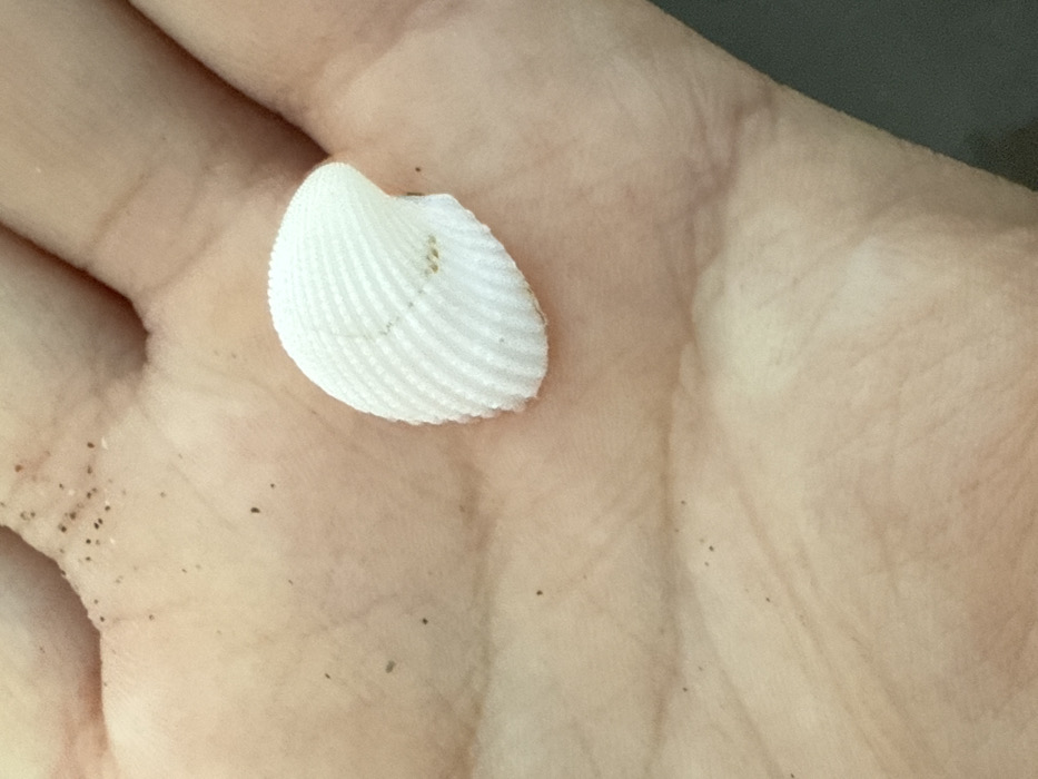 A close-up, top-down view depicts a light-skinned human hand holding a single, small, white bivalve seashell fragment