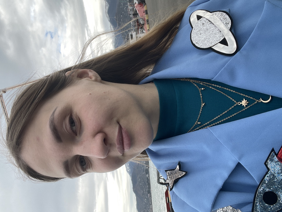 A fair-skinned female, appearing to be in her 20s or 30s, is depicted in a mid-shot outdoor portrait. She has long, light brown hair, which is parted on the side, and is looking directly at the camera with a slight smile. She wears a light blue blazer over a teal turtleneck shirt. Adorning her blazer are multiple space-themed brooches: a silver glitter five-pointed star on the left lapel, a silver glitter planet with rings on the right side, and a partially visible blue glitter rocket ship on the lower left. She also wears three layered gold-toned necklaces with a beaded chain, an eight-pointed star pendant, and a crescent moon pendant. Sunglasses with light-colored frames are perched on top of her head. The background features a large body of water, identifiable as the Black Sea, and distant, partially snow-capped mountains. Coastal city structures are visible along the shoreline. The scene is located in Batumi, Georgia, under an overcast sky, with elements suggestive of a port or industrial area visible on the right side of the frame.