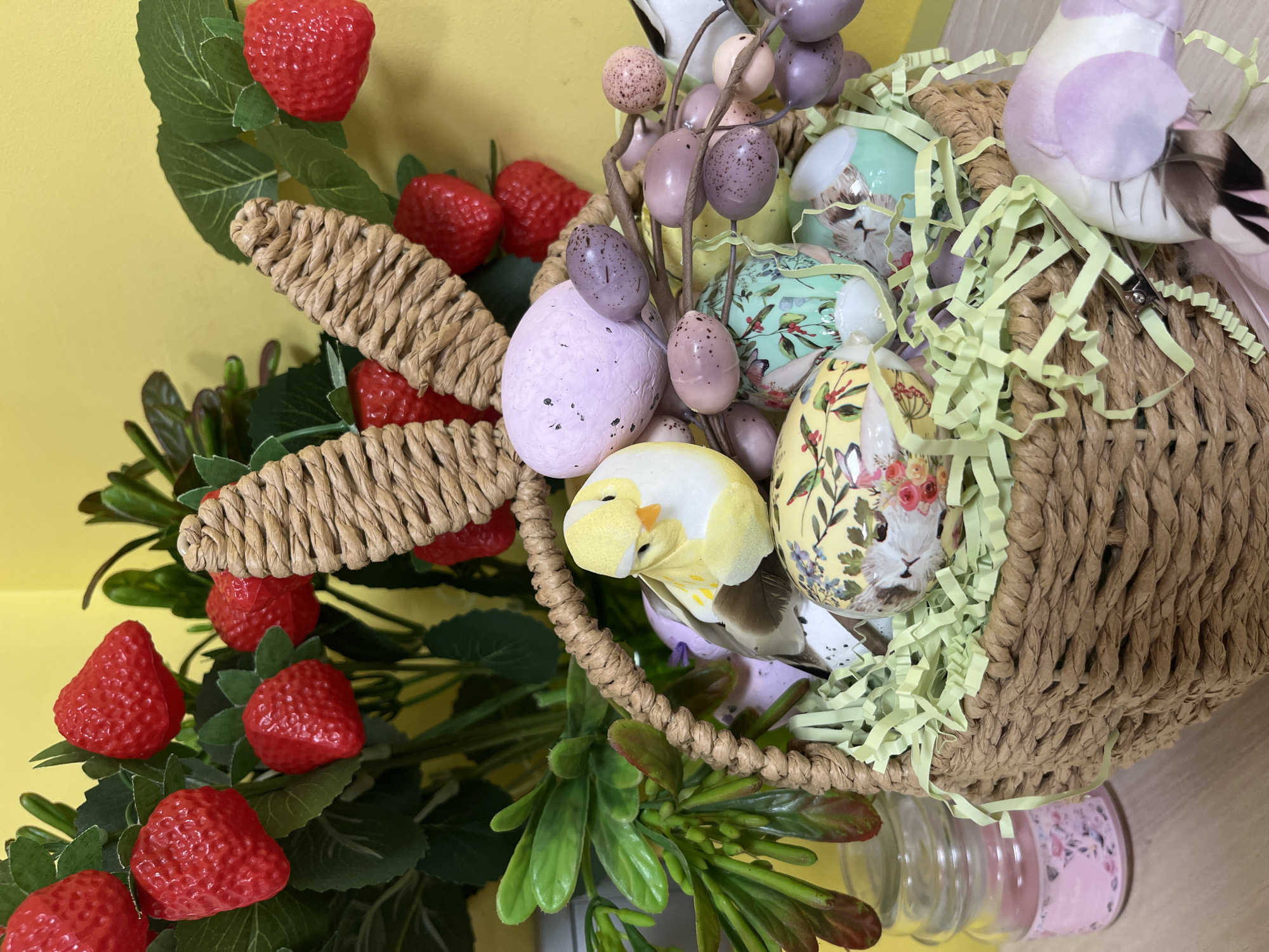 A close-up shot shows a woven basket filled with Easter decorations, including decorated eggs, artificial birds, and pastel-colored egg-shaped ornaments on sticks. The basket also contains light green shredded paper simulating grass. Attached to the basket's exterior are artificial strawberries and green leaves. A pink-labeled glass jar is visible underneath the basket. The background is a solid yellow color. The photo was taken indoors. The image’s subject does not depict Haskovo, Bulgaria specifically, and no details can confirm its location.