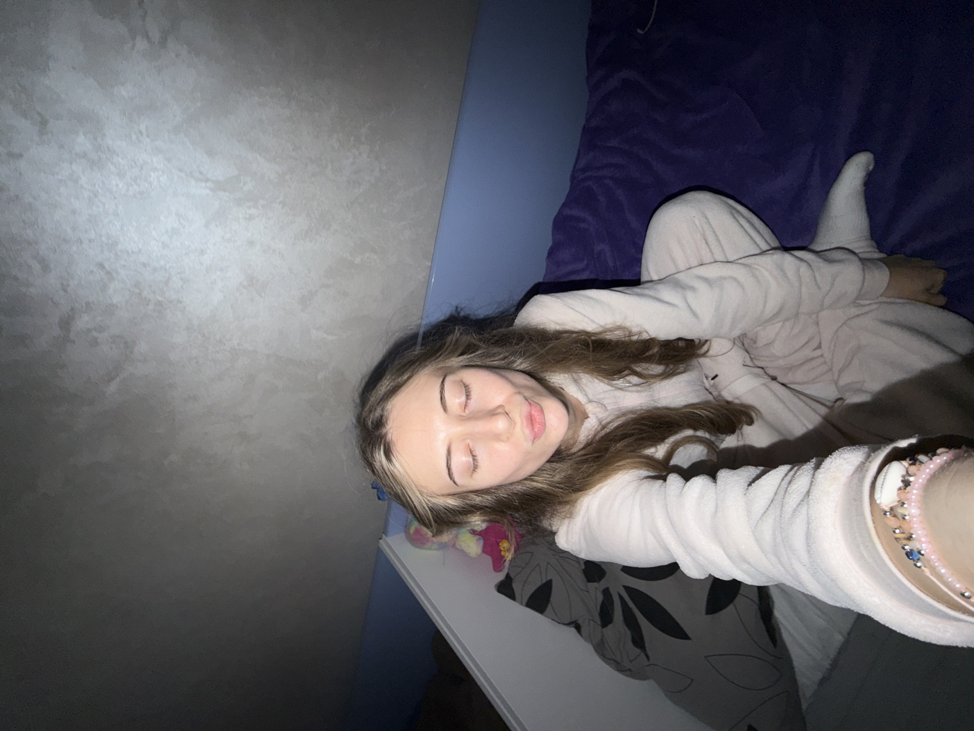 A young person lies on a bed, apparently in a bedroom. They are wearing a light-colored pajama set and white socks. Their eyes are closed, and they appear to be relaxed. The bed has purple bedding and a blue headboard. A wall with a textured finish is visible in the background. A small bedside table is visible to the left of the person, with a pillow covered in black-and-white floral-patterned fabric. The image offers no specific information to infer a location within Plovdiv, Bulgaria or to confirm if it is taken there at all.