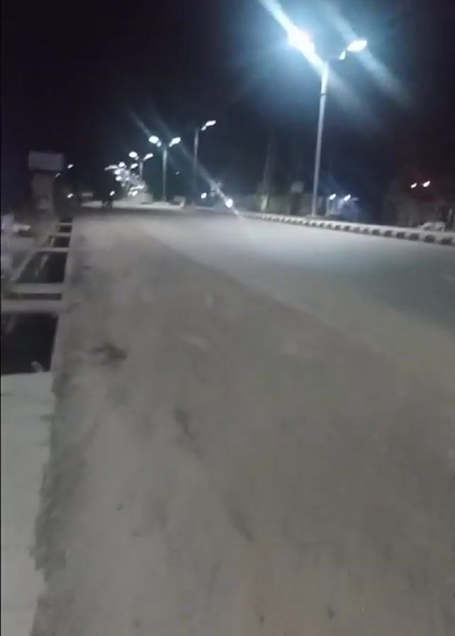 The video depicts an empty road at night, illuminated by bright streetlights. The camera pans from a sidewalk with a drainage ditch along the roadside up to the road itself, then to a bright streetlight, then back down to the road. A parked motorcycle is briefly visible on the roadside. The video appears to be taken with a handheld device, resulting in some shakiness.