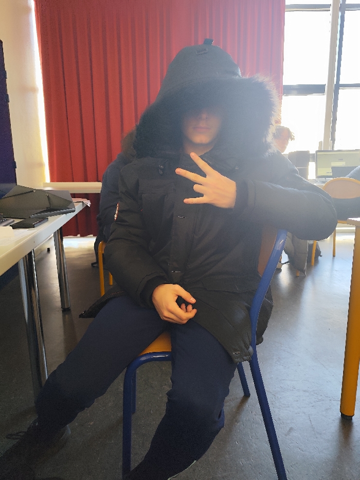 This image depicts an indoor scene within a facility in the city of Schiltigheim, France, consistent with a classroom or computer lab environment. A single individual is prominently seated in the foreground on a chair featuring a blue metal frame and a yellow seat, facing the camera. This person wears a black hooded parka with a fur-lined hood, which is pulled up and obscures the upper portion of their face. Their left hand is raised, displaying a gesture where the index and middle fingers are extended in a 'V' formation, the thumb is also extended, and the ring and pinky fingers are curled into the palm. Their right hand rests on their lap. The individual is also dressed in dark blue pants and dark shoes. To the immediate left, a light-colored table holds a closed dark-colored laptop or tablet and a smartphone. The background includes red curtains covering a wall on the left side, and large windows on the right, through which bright natural light illuminates the room. At least two other individuals are partially visible in the background, one appearing to be positioned near a computer monitor. The floor is a dark, textured material.