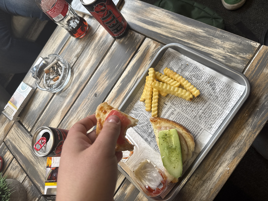 The scene depicts a close-up, downward-angled view of a casual dining table, likely within a cafe or eatery in Sliven, Bulgaria. A person's left hand, with visible pink nail polish on the thumb, is holding a small, triangular piece of baked food, possibly a mini pizza slice or savory pastry with a pink filling, positioned above a metal serving tray. On the gray metal serving tray, which is lined with paper displaying newspaper-style text, there is an open-faced sandwich or toast topped with a slice of white bread, a layer of spread, a slice of cured meat, and a thick slice of cucumber garnished with green seasoning. Adjacent to this, a portion of crinkle-cut french fries is present. A transparent plastic container with two compartments holds red ketchup and a white condiment. Arrayed on the distressed wooden table, which features horizontal planks with a gray and brown finish, are several items: an open red "HELL Classic" energy drink can, and another open red "HELL" energy drink can with an orange-rimmed pull tab. A clear glass bottle containing a red liquid is next to the "HELL Classic" can. A clear glass ashtray, filled with multiple cigarette butts and ash, sits centrally, accompanied by a silver disposable lighter. Two cigarette packs are visible: one light-colored, open pack revealing cigarettes, and another partially visible darker pack. A small potted plant with green foliage in a gray container is located in the upper left of the frame. Blurry elements in the background indicate the presence of other individuals, showing parts of blue jeans and a green-and-white shoe.