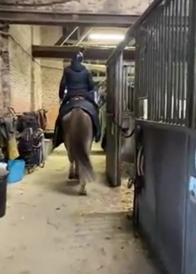 - "A person wearing a black coat and riding helmet rides a horse down the center of a stable aisle" by FM-xTDQG2, licensed under CC BY 4.0