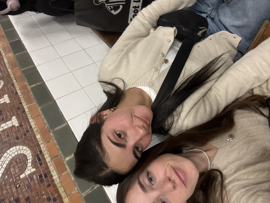 Two young adult females are seated, posing for a close-up photograph within a New York City subway station. The environment consists of a typical subway station wall, featuring a mosaic tile section in the upper background. This mosaic displays the stylized letters "ST" in white tesserae against a reddish-brown, brick-like background, outlined by decorative white elements. Below the mosaic, a horizontal band of dark green rectangular tiles runs across the wall, followed by a larger section of white square ceramic tiles. A wooden bench or seating structure is partially visible where the individuals are seated. In the upper right background, a black shopping bag with partially legible white text, "Foot L" (likely "Foot Locker"), is visible, along with a light pink over-ear headphone set suspended out of frame. The individual on the left has long brown hair and light blue eyes, wearing a light beige cable-knit sweater, a white beaded choker, and a silver pendant necklace. Her face is slightly angled, and her lips are closed. The individual on the right has dark brown hair parted down the middle and dark eyes. She wears a light beige button-up cardigan over a white top, light blue jeans, small gold hoop earrings, and a gold pendant necklace. A black fabric fanny pack or sling bag is worn across her chest. Her head is tilted, resting near the left individual, and both are looking directly at the camera with slight smiles.