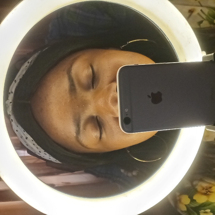 A female individual with dark skin and dark hair is centered in a close-up, head-on shot, framed by a circular LED ring light