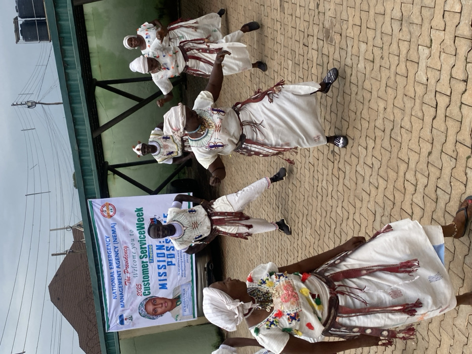 The image displays an outdoor scene in Unguwar Sarki, Nigeria, featuring six individuals performing a traditional dance. A large white banner, identifying "NATIONAL EMERGENCY MANAGEMENT AGENCY (NEMA) The Presidency 2023 Customer Service Week" with the theme "MISSION: POSSIBLE," is stretched horizontally in the background. The banner includes the Nigerian coat of arms, the NEMA logo, and a portrait of Zuraida Umar. A silver vehicle is partially visible behind the banner. The six performers, five females and one male visibly in focus, are dressed in predominantly white or off-white garments. Their short-sleeved tops are decorated with colorful embroidery and beadwork around the necklines. Each wears a dark reddish-brown sash or waist wrap, some with fringed ends and circular decorative elements. Most individuals wear white head coverings. Footwear varies, including dark shoes, sandals, and flip-flops. They are captured in dynamic, mid-dance postures with bent limbs and varied foot positions. The ground surface is paved with light brown interlocking concrete pavers. A light green building with a dark roof and exposed structural beams is situated in the mid-ground, to the right of the banner. Utility wires, a pole, and a black water tank on the building's roof are visible against an overcast sky.