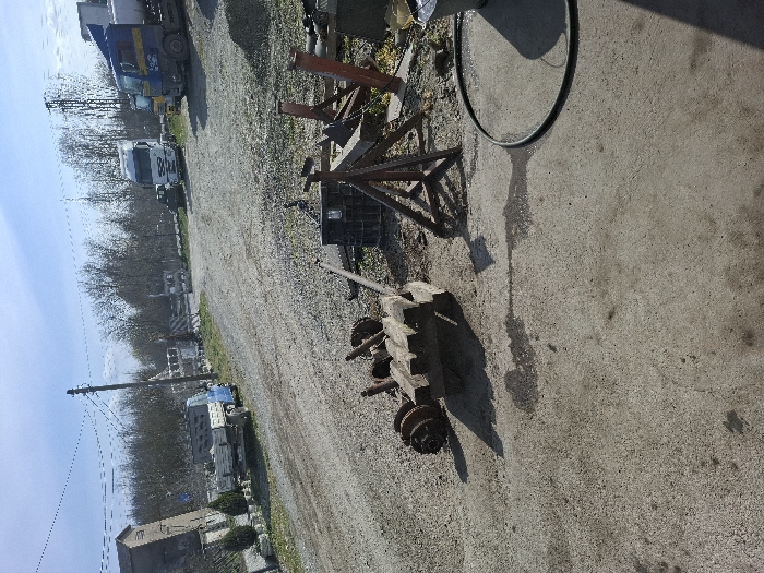 The image presents an outdoor industrial or storage yard in Burgas, Bulgaria, under clear daytime conditions with distinct shadows cast by objects. The foreground comprises a concrete surface, which transitions into a gravel and dirt road sloping gently uphill towards the background. In the lower-left quadrant, a stack of heavy, weathered wooden blocks lies on the concrete, adjacent to several detached metal machinery components, including what appears to be an axle and two rusty wheel hubs. To the right of these items, two rusty, triangular metal structures, resembling sawhorses or equipment stands, are positioned on both concrete and exposed dirt. A black plastic crate is visible near these stands, and a long, light-colored metal bar extends diagonally from the vicinity of the wooden blocks towards the right. In the lower-right corner of the frame, a coiled black hose rests on the concrete, next to a partially visible silver metal bucket. The mid-ground and background feature a variety of parked vehicles on the gravel surface. On the left side of the gravel road, a light blue pickup truck with a white, open-cage bed is parked. Further back and slightly to the right, a white semi-truck tractor unit is visible, followed by a blue tanker truck parked to its right. Additional vehicles, including a dark-colored car and another truck (possibly yellow), are partially visible behind these main vehicles. A tall, multi-story building, light brown or beige in color with a flat roof, is situated on the far left of the frame, behind the blue pickup truck. A wooden utility pole with multiple overhead power lines stands vertically in the mid-ground on the left. The background is dominated by a dense cluster of bare trees and shrubs, indicating a season of dormant vegetation. The sky above is clear blue with minimal cloud cover. No individuals are present in the scene, and no active work or interactions are depicted.
