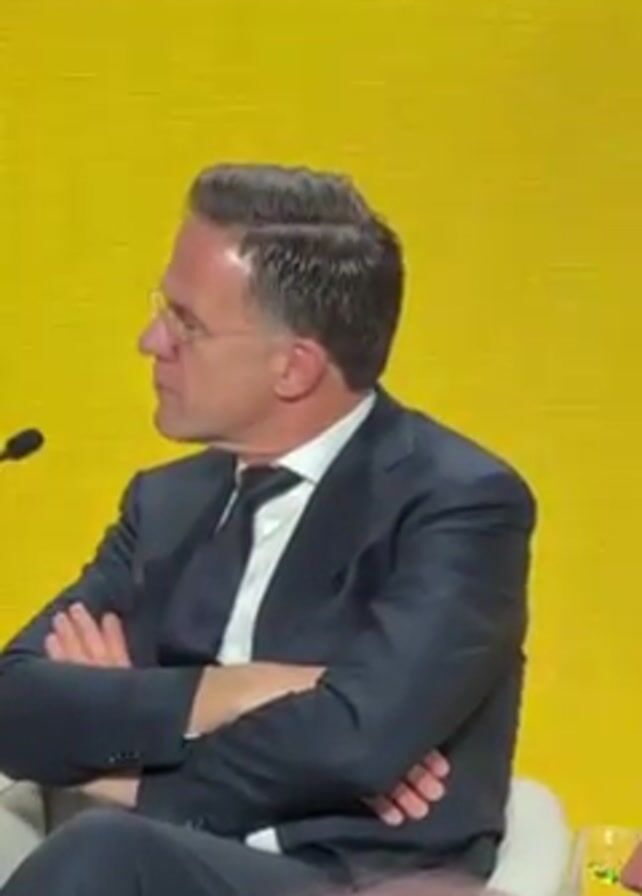A man in a dark suit with glasses is sitting in a white chair, with his arms crossed. He is facing left, listening to someone off-screen. There is a microphone in front of him, and a bright yellow background. A clear glass with a logo on it is to the right of the man, along with another person out of focus.