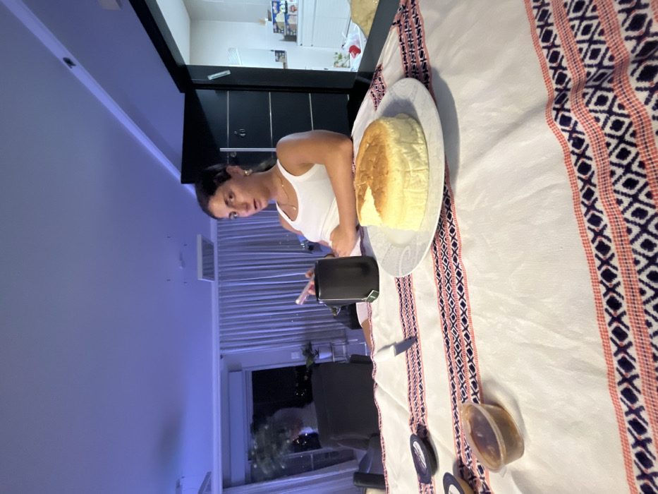 The scene depicts an indoor residential setting in Rishon LeZion, Israel, characterized by dim, cool-toned blue ambient lighting. A female individual with dark hair pulled back, wearing a white tank top and gold earrings, is seated at a table. Her expression is one of slight surprise, with her mouth agape, as she looks towards the camera. She holds a light-colored smartphone in her left hand, while her right hand rests near a dark cylindrical mug from which a tea bag tag is visible. The table is covered with a white tablecloth featuring repeating bands of red and dark blue geometric patterns. On the table, from left to right, are two small clear plastic containers, one holding a brown viscous substance, followed by a small silver knife with a white handle. A white plate centrally holds a whole, round, light-colored cake, from which a slice has been cut from the top. In the background, a large glass door or window on the left reveals a dark exterior with reflections of indoor elements, including a dark chair and what appears to be foliage. Light-colored curtains are drawn across this opening. To the right of the seated individual, an open doorway leads into an adjacent room, possibly a kitchen, where brighter, warmer lighting illuminates shelves with various items and white surfaces. The ceiling is white throughout the visible interior.
