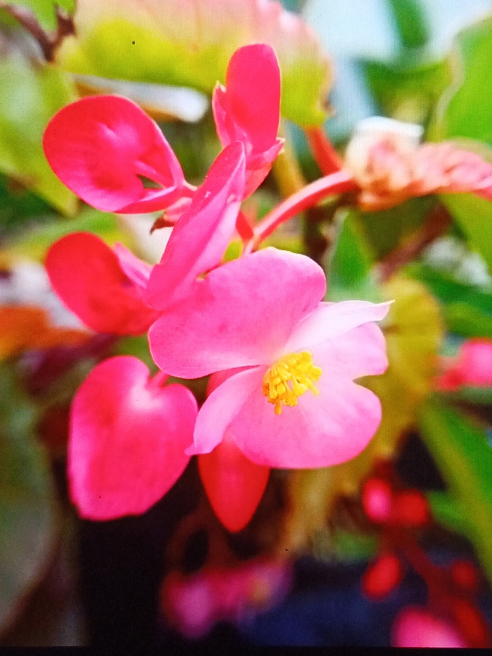 A close-up reveals a cluster of pink begonia flowers, some intensely red and others a softer pink with a yellow center
