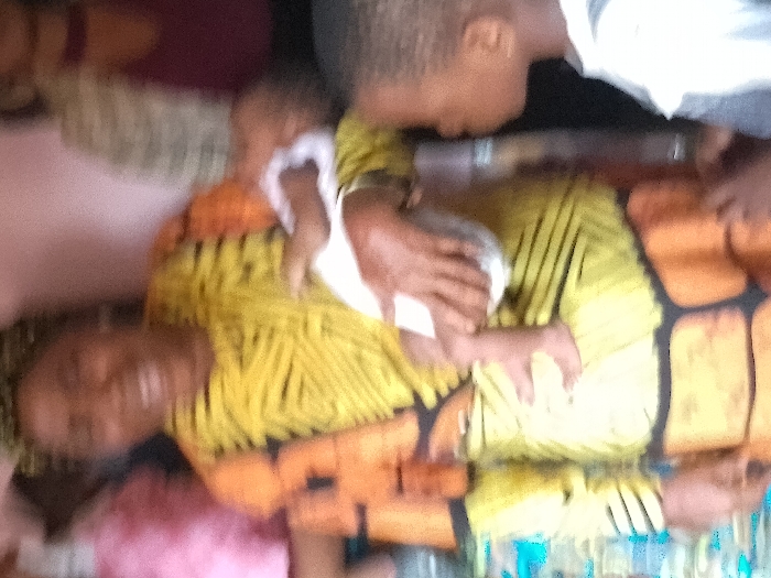 The image depicts an indoor scene in the city of Unknown, Unknown, primarily featuring an adult female holding an infant, with a young child observing from the right. The entire photograph is significantly blurred, consistent with motion or focus issues. The central figure is an adult female, positioned in the mid-ground, her face a blur suggestive of a wide smile or laugh. She wears a long-sleeved garment patterned with yellow and black stripes on the torso, contrasting with solid orange-brown fabric on the sleeves and lower body that features black rectangular designs. She holds an infant on her left side, partially wrapped in a white cloth or wearing a light-colored garment, with its bare legs and feet visible. To the lower right, a young child, possibly a toddler, is visible in profile, with short dark hair and wearing a light-colored top. This child is looking towards the adult female and infant. In the background, partially visible figures include a person wearing a pink garment on the left and another in a maroon top on the right. The background wall appears to be a faded pinkish-beige, and a light blue/teal patterned surface is discernible at the lower left.