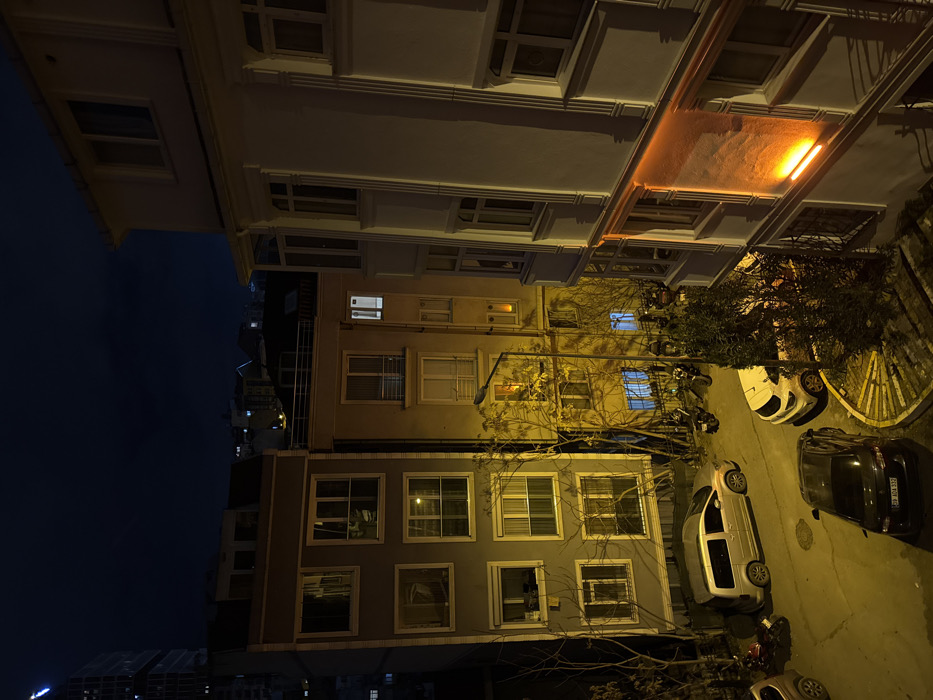 - "At night, an upside-down perspective reveals buildings with lighted windows, cars parked along a street, and bare trees" by FM-E68DV2, licensed under CC BY 4.0
