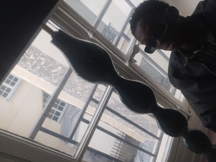 The image captures an indoor scene looking out through a window to an urban environment in Paris, France. A single individual, appearing male with dark skin and short dark hair, is positioned in the upper right, wearing dark sunglasses and a dark jacket with a subtle pattern on the shoulder. His head is tilted, and he is looking generally towards the lower left. A prominent, dark, glossy, multi-lobed decorative object, resembling a large ornate piece of glass or polished material, extends upwards from the lower-left foreground. Through the multi-paned window, a light-colored (beige or off-white) building with multiple rectangular white-framed windows is visible. Above this building, a textured greyish surface, possibly a roof or paved area, is also visible.