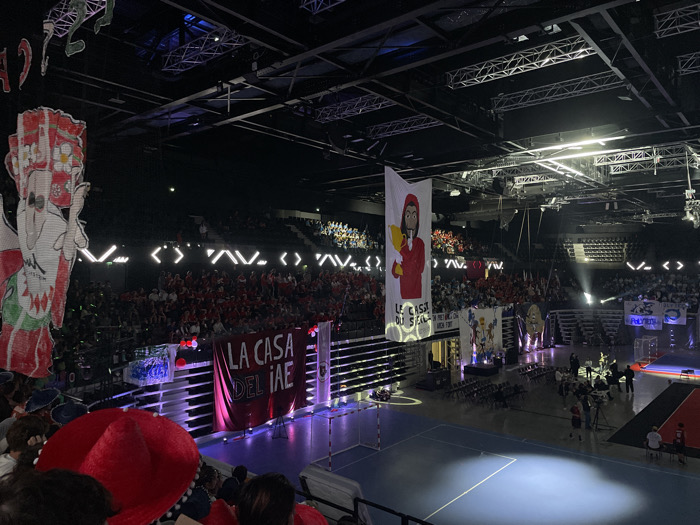 The image displays an elevated perspective of a large indoor arena in Aix-en-Provence, France, characterized by a high ceiling with exposed metal trussing and overhead lighting fixtures. Tiered seating, largely occupied by a crowd of spectators, many wearing red, encircles a central court. On the left, a large, partially cropped white banner depicts a stylized red-and-white figure with green accents. A prominent white banner in the center-left features a cartoon figure in a red hooded outfit holding a golden trophy, with the text "LE CASSE DU SIECL" below. Beneath the seating on the left, a dark red banner reads "LA CASA DEL IAE". The court surface is predominantly light blue with white markings, indicative of a sports court, and includes a smaller, distinct red-orange section on the right. Scattered individuals are present on the court, clustered near a raised platform or stage, surrounded by rows of chairs and professional broadcasting equipment, including multiple camera tripods. Spotlights illuminate specific areas of the court, creating bright pools against the overall dim lighting of the arena. A series of bright, angular white lights are visible along the upper perimeter of the seating sections. In the immediate foreground, the back of a spectator's head, adorned with a red, wide-brimmed hat featuring white pom-poms, is visible.