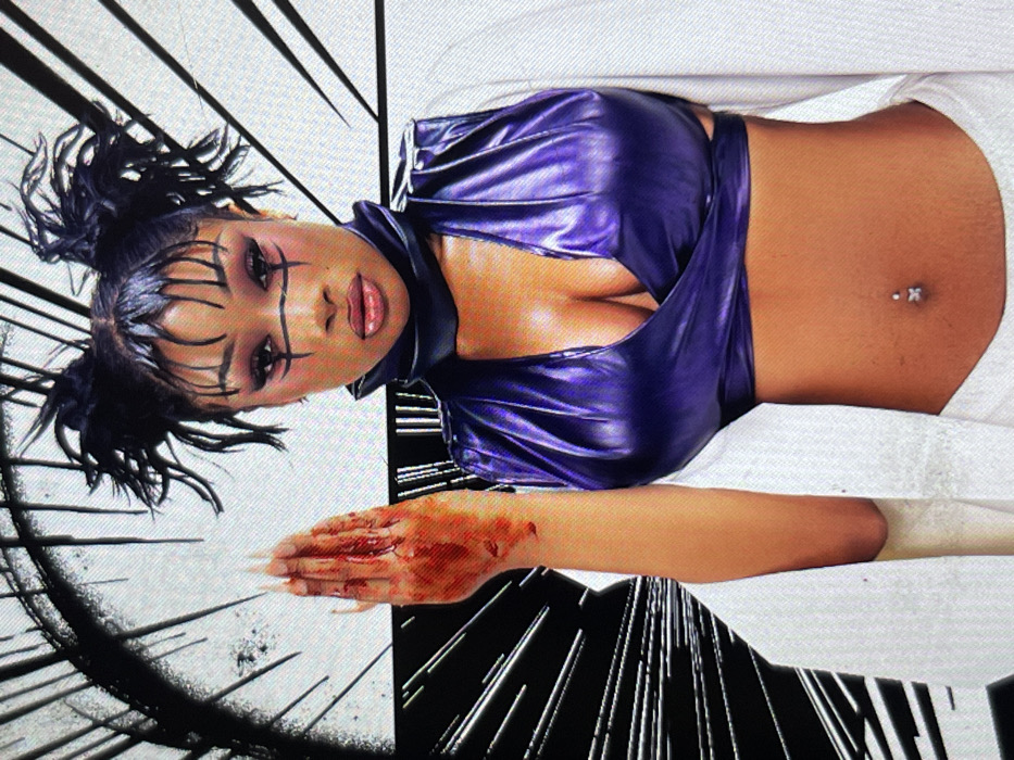 A person lies on a white surface, possibly a bed. They wear a shiny purple top that exposes the midriff. Their dark hair is styled in short spiky knots and their face is adorned with unique black markings. The person's hand, marked with red coloration resembling blood, is visible. The background features an abstract, possibly graphic, design with black lines on a white base. The image appears to be a staged or artistic shot.