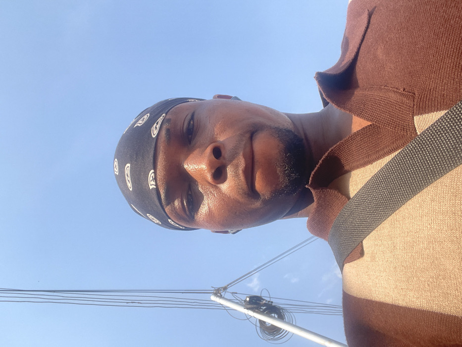 This image depicts a dark-skinned male subject, photographed from a low-angle perspective against a clear blue sky in Okpanam, Nigeria