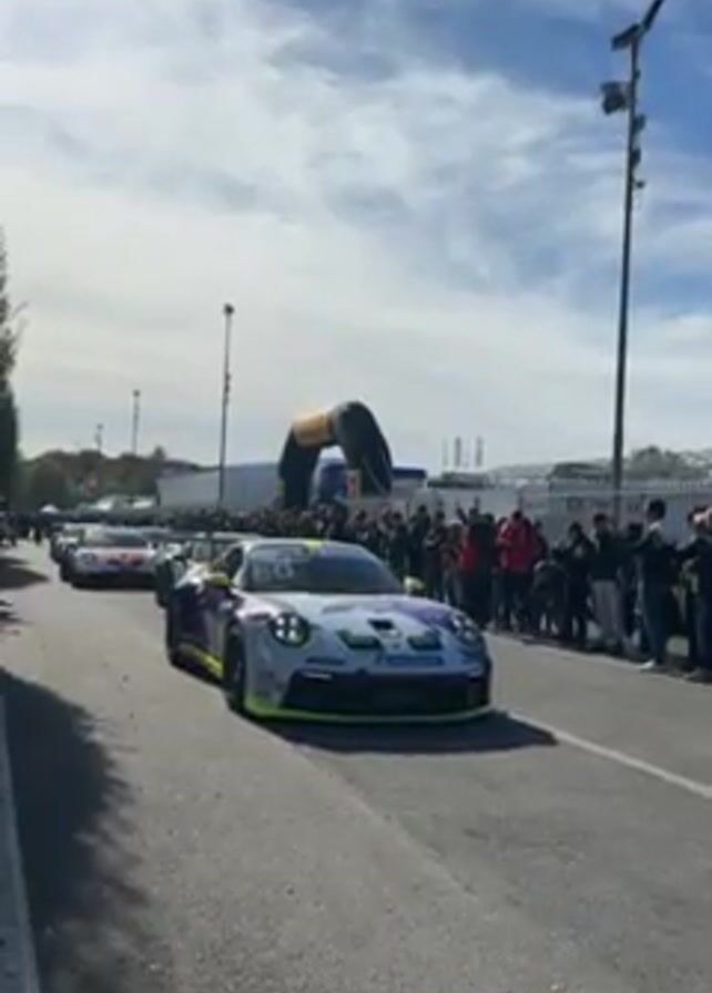 row of race cars slowly driving along a road lined with spectators on one side. The first car is a white Porsche with purple and green accents and the number 80 prominently displayed on the hood and side. The crowd is mostly composed of people standing behind barriers. The sky is partly cloudy and several light poles are visible along the road. In the distance, there is a large arch. The video captures the sound of the car engines.