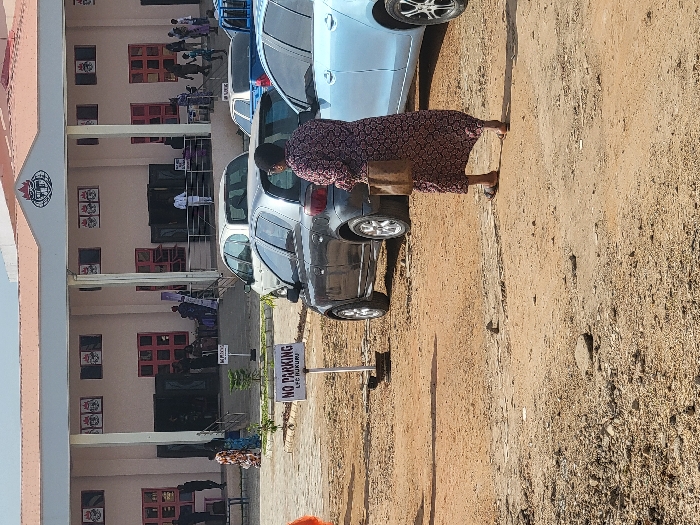 This image depicts a daytime scene in Gura Top, Nigeria, focusing on a large building and its unpaved forecourt. The prominent, light-colored building features a reddish roof, a central portico with columns, and a pediment displaying a crest. Red-framed windows and multiple dark doorways are visible on the building's facade. In the foreground, a woman, viewed from behind, walks rightward, wearing a patterned long dress, sandals, and carrying a light brown shoulder bag. Several vehicles are parked in the middle ground, including a dark grey hatchback, a light blue sedan, and a white sedan. A white sign reading "NO PARKING LFC KUKURU" stands on the left. Approximately 15-20 individuals are congregated near the building's entrance, one of whom wears a white garment. The ground consists of dry, light brown soil mixed with gravel and small stones, with some sparse green vegetation. The scene is brightly lit under a clear sky.