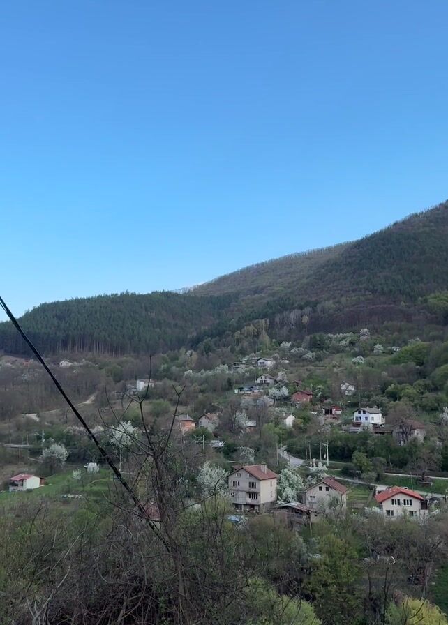scenic view of a small village nestled in a valley against a hillside covered in trees. The sky is a clear blue. The houses in the village are mostly small with red-tiled roofs. White blossoming trees are scattered throughout the village and on the lower slopes of the hill. A line of taller, darker green coniferous trees is visible at the top of the hill. Utility poles and wires cross the foreground. A large evergreen tree branch frames the view on the right.