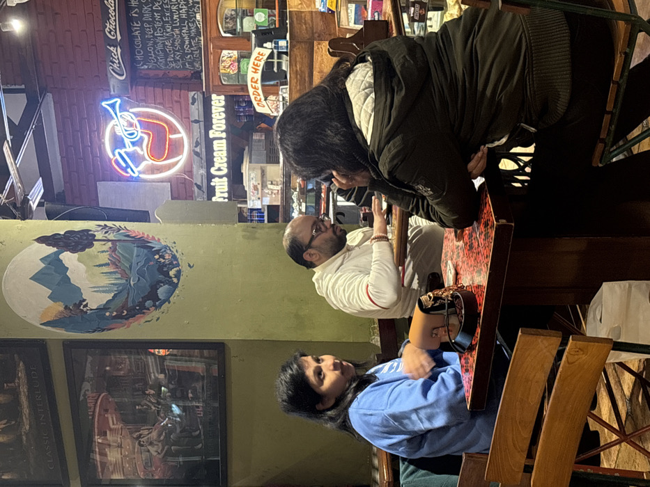 Three people are seated at a table in a restaurant with a vintage, slightly worn ambiance. A woman with long hair wears a dark jacket. A man in a white shirt sits across from her, gesturing as he speaks. A woman in a blue sweatshirt sits at the opposite end of the table. The restaurant features vintage signage, including neon signs for "Chick Chocolate" and "Fruit Cream Forever." There's a painted mural on the wall and framed artwork below it. The table has a red patterned surface.