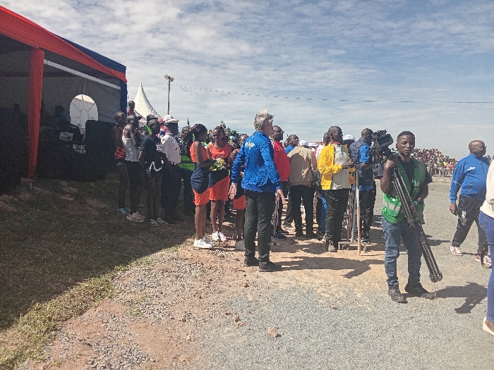 A group of people stands outside on a partly sunny day. Some individuals wear athletic attire, while others are dressed in casual clothing. A cameraman, clad in a green vest and jeans, holds a tripod. A tent with red and black draping sits to the left. Behind the crowd, a distant, blurred mass of spectators can be seen on a hill. The ground is covered in gravel.