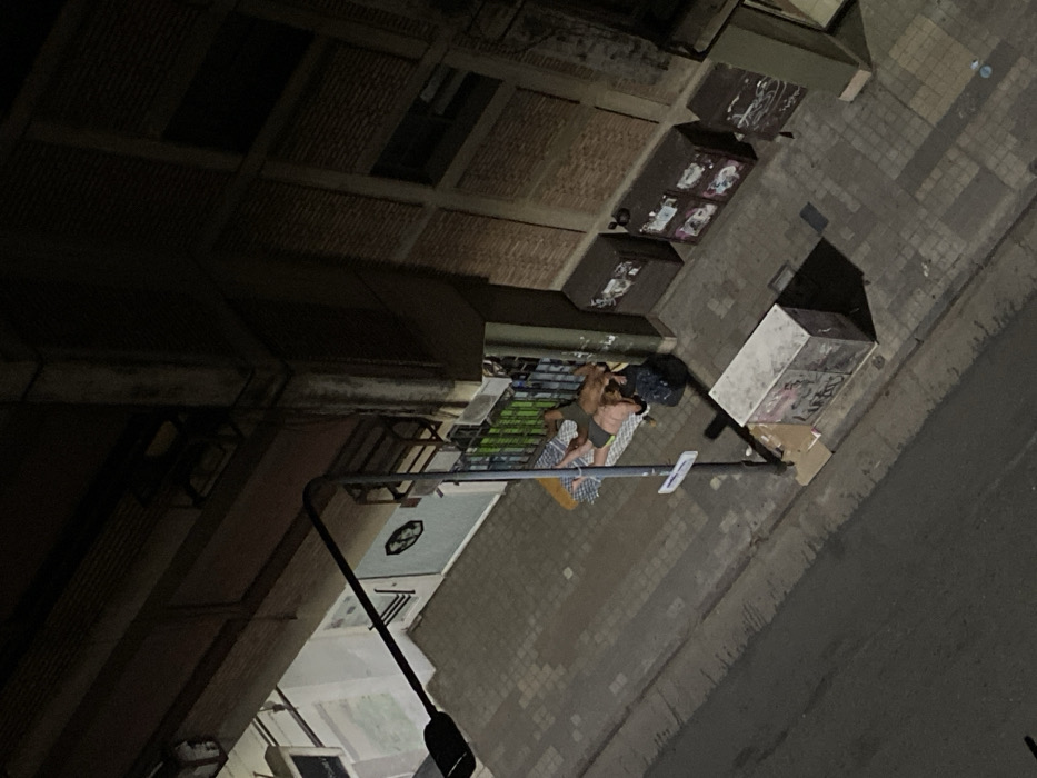 A top-down, nighttime image depicts an alleyway between buildings. Several covered trash bins line the right side of the alley. A street lamp pole runs diagonally across the lower half of the frame. Under a building overhang, two partially clothed individuals are near what appears to be a makeshift bed in front of a storefront. A black bag sits near them. The alley leads to a dark street in the distance.