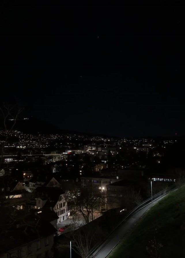 night cityscape. In the foreground, there are buildings with illuminated windows, trees with bare branches, and a path with a lamppost. In the background, there is a dark mountain range with lights dotting its base, presumably marking a town or city. The sky is dark, with a few visible stars. In the audio, there is a brief conversation in French.