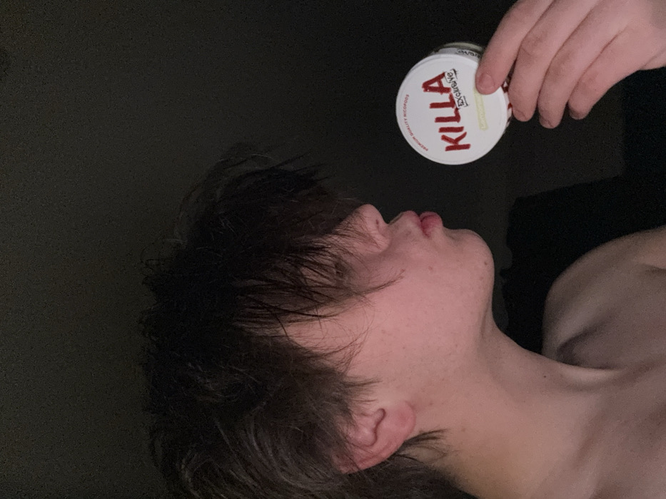 An individual with dark, disheveled hair tilts their head back, lips slightly parted. The person's skin appears pale with visible freckles. A round container, labeled "KILLA," is held above their mouth by a hand. The background is dark and blurred. The person's upper torso is partially visible, appearing bare-chested or wearing a dark, undefined garment.
