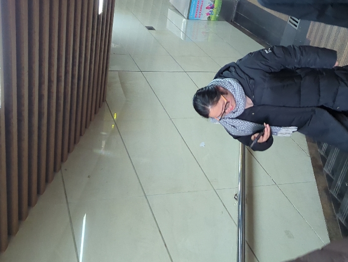 A woman wearing a dark puffy coat and gray patterned scarf is looking at her phone. She has glasses on and her hair pulled back. She stands next to a silver railing. The background includes light-colored tiled flooring and a wall with vertical wooden slats. A person in a dark coat is partially visible in the top right corner.
