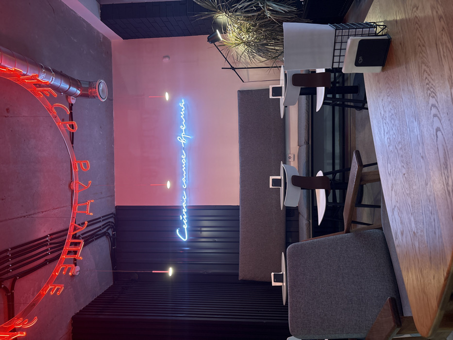 The image depicts the interior of the "ГУЛЯЙ ДАЛЬШЕ" café, located at Ligovsky Prospekt, 74, Saint Petersburg, Russia. The scene is illuminated by red and blue neon signs, recessed ceiling lights, pendant lights, and an articulated floor lamp, creating a dim, modern atmosphere. The ceiling is unfinished concrete, featuring exposed black electrical conduits and silver ventilation ducts. A red neon sign displaying "ГУЛЯЙ ДАЛЬШЕ" (Walk Further) in Cyrillic hangs upside down from the ceiling. The left wall is covered with dark, vertically ribbed paneling. The rear wall features a long, dark grey upholstered bench seat. In front of this bench are several small, round, light grey tables, each accompanied by a pair of white and dark-backed minimalist chairs. Every table is equipped with a black napkin dispenser. Above the bench, a light pink wall section displays a horizontal blue neon sign reading "Сейчас самое время" (Now is the right time) in Cyrillic. To the right, a black articulated floor lamp stands next to a tall potted plant, partially obscuring a dark brick-patterned wall. In the immediate foreground, a grey upholstered armchair with wooden armrests sits beside a wooden table. No individuals are present in the depicted scene.