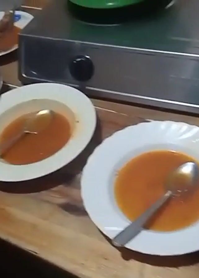 wooden table with several dishes of what appears to be soup or stew. There are three white plates with orange liquid and spoons in them. Additionally, there is a smaller metal bowl with the same orange liquid and a spoon. A plate containing what looks like a piece of meat or bone in the orange liquid is also visible. Next to the dishes, there is a stainless steel gas stove with two burners. An orange plastic container sits on the edge of the table. A person's hand reaches into a metal pot, possibly filled with the same soup or stew.