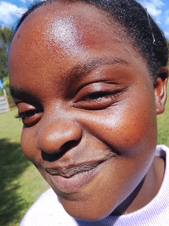This close-up outdoor portrait, taken in Mahiakalo ward, Kenya, features an individual of African descent