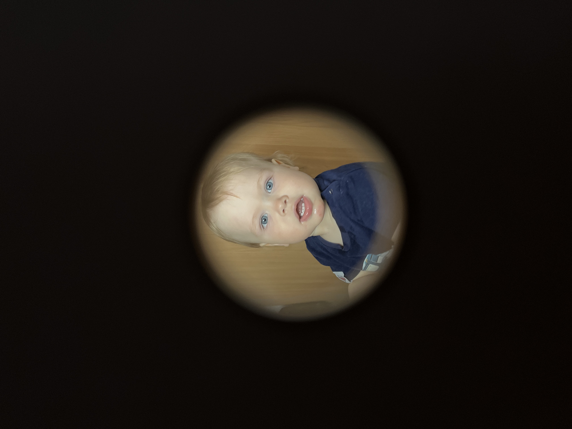 A toddler with blond hair and blue eyes, wearing a blue shirt, is seen through a circular opening