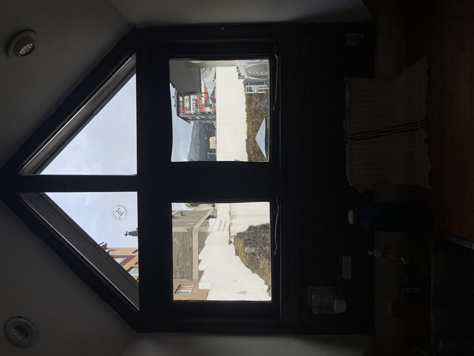 A triangular window frames a cloudy sky and a partial view of buildings. A second, rectangular window displays buildings and a mountain. A dark interior includes a partially visible countertop, possibly a sink, a towel, and cleaning supplies. The room is dimly lit, contrasting with the brightness visible through the windows.