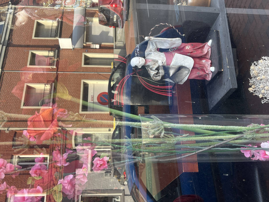 The image displays a street-level shop window in Croix, France, presenting a layered view of interior display items overlaid with exterior reflections. Inside the window, on the left, a tall clear cylindrical vase contains multiple green artificial plant stems, some with a fuzzy texture, and pink artificial flowers at its base. To the right, a white-faced figurine, approximately 20-25 cm tall, stands on a black square base. It is dressed in a light grey or silver wide-sleeved garment over a red lower garment with subtle white patterns, resembling traditional Japanese attire. The figurine holds a thin, dark, coiled wire in its right hand. Behind the figurine, a dark rectangular object with red arcing lines and the partially visible text "TAILS" is positioned. On the display floor, beneath the figurine, a cluster of dried white or light-colored organic material is present. The window's surface reflects an urban street scene. Dominantly reflected is a multi-story building constructed of reddish-brown brick, featuring multiple rectangular windows, some with dark railings, and a ground-floor light-colored door adjacent to a closed light grey garage-style door. A red circular "no parking" sign (*arrêt interdit*) is clearly reflected on the garage door. Reflected vehicles include a dark blue sedan parked on the street and a red van further down on the right. Bright daylight illuminates the scene, enhancing the reflections of additional large pink artificial flowers across the upper and central parts of the window, suggesting further floral elements inside the display.