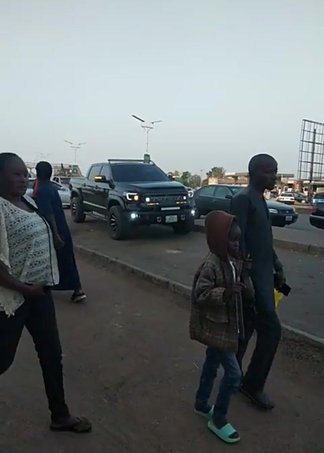 pedestrians, including two children, walking along a street. The camera focuses on a black Toyota Tundra pickup truck with modifications. The truck features an aftermarket grille with "TOYOTA" displayed, a roof rack, custom wheels, and various auxiliary lights. The video captures the truck from different angles, emphasizing its modified appearance. The surrounding area appears to be a roadside with other vehicles parked or passing by.