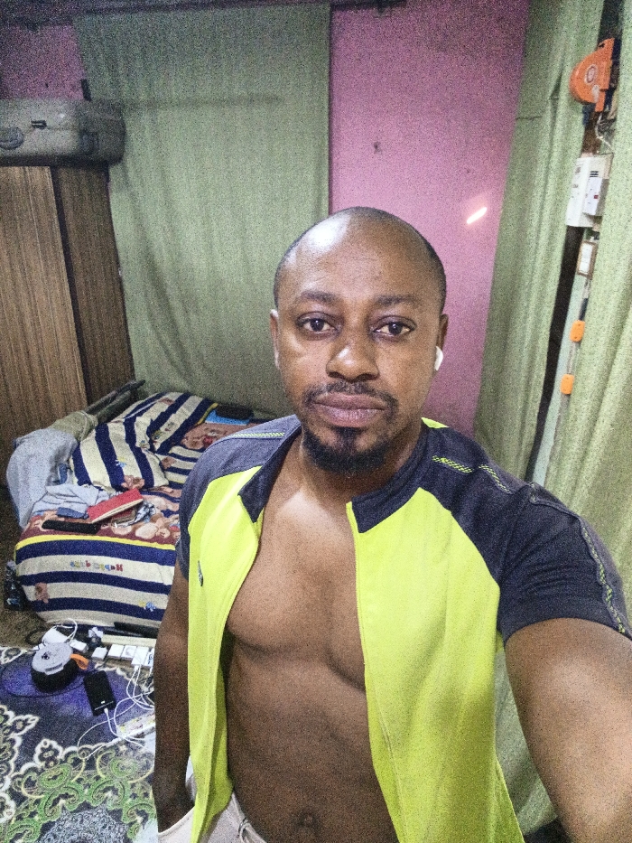 A close-up shot shows a bald, dark-skinned man with a trimmed beard. He's wearing wireless earbuds and an unzipped, short-sleeved shirt in lime green and dark gray, revealing his chest. The background features a wooden wardrobe and rumpled bed with striped bedding. Drapes hang on the right side of the frame, with a pinkish wall in the upper background. A small device and assorted cables sit on a patterned rug next to the bed.