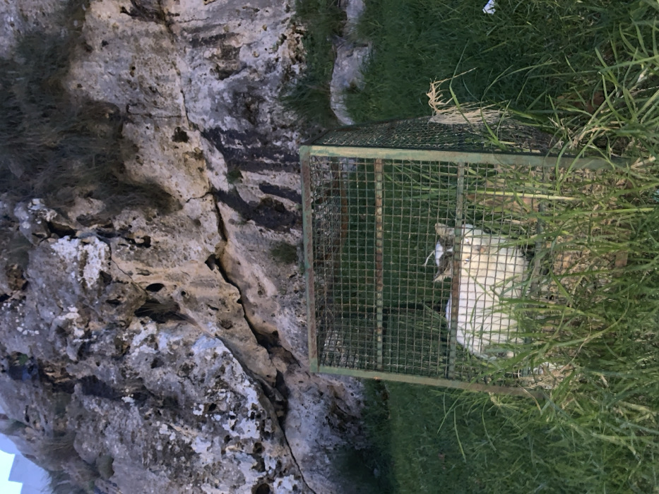 A white bird sits inside a green wire cage. The cage rests in green grass near a large rock formation. The rock has a rough, uneven surface with various shades of gray and black, and some patches of white. Tall blades of grass partially obscure the cage. The photograph appears to be taken outdoors, possibly in a natural or semi-natural environment.