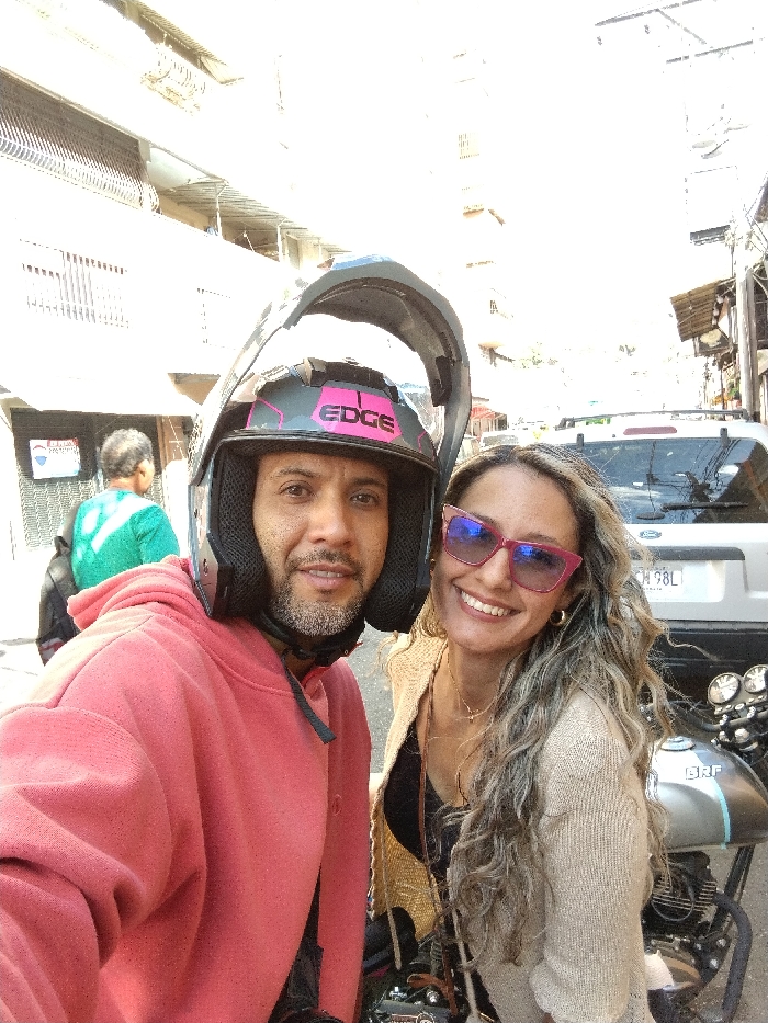A selfie-style photograph captures two individuals on a city street in La Victoria, Venezuela