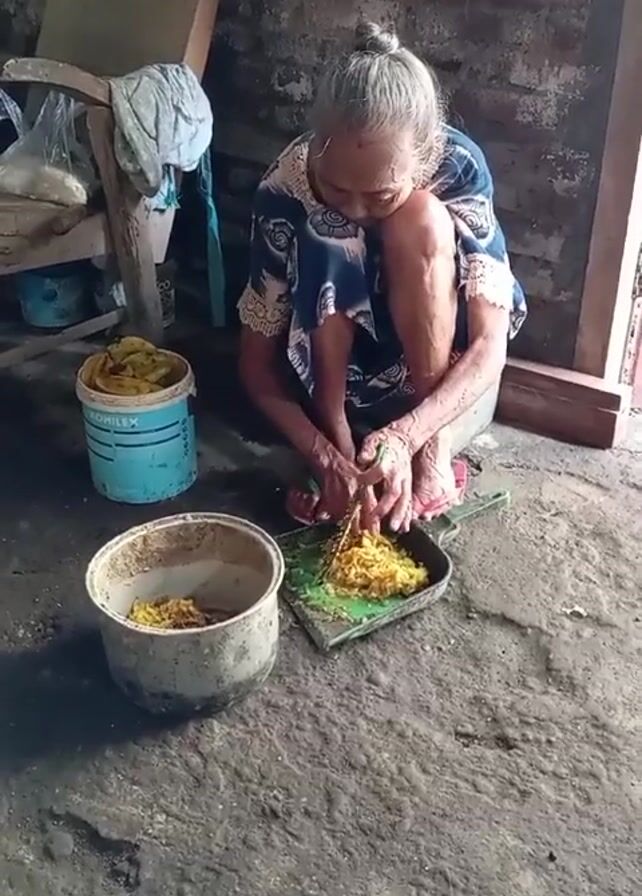 An elderly woman with her hair in a bun is squatting on a concrete floor, slicing what appears to be cooked noodles with a knife on a green dustpan