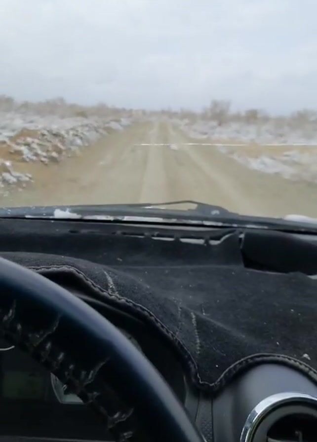 car's dashboard and steering wheel from the driver's perspective, traveling on a dirt road. Patches of snow are visible on either side of the road. The sky is overcast.
