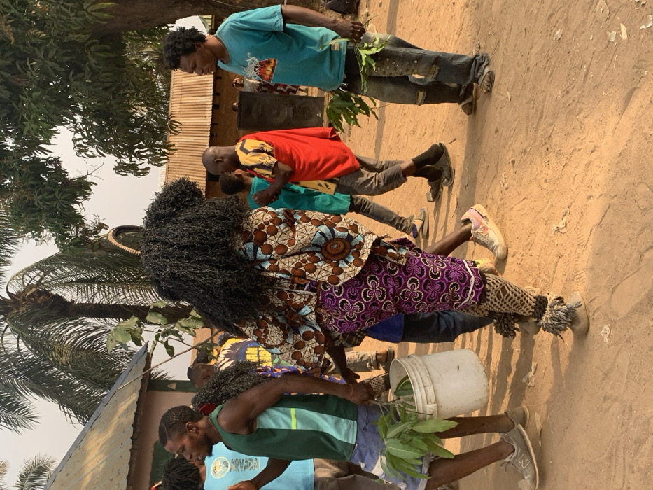 A group of people walks on a dirt path, dressed in colorful clothing. One individual wears a large, dark, possibly braided wig and patterned robes. Another carries a white bucket filled with green leaves. The group is walking away from the camera's perspective, moving past a corrugated metal structure and under the shade of trees. Some individuals are casually dressed in t-shirts and shorts. The scene appears to be outdoors in a rural setting.